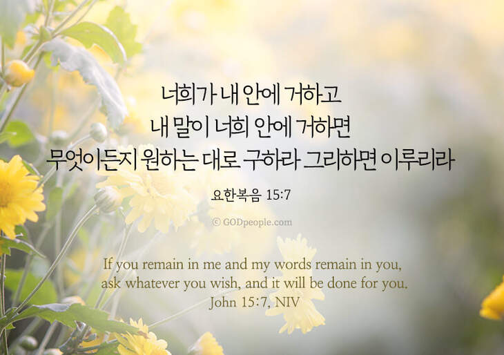 너희가 내 안에 거하고 내 말이 너희 안에 거하면 무엇이든지 원하는 대로 구하라 그리하면 이루리라 – 요15:7 If you remain in me and my words remain in you, ask whatever you wish, and it will be done for you. – John 15:7, NIV ♥ 교도소 재소자에게 성경책을 보내드립니다. [플로잉전용상품] 재소자에게 성경책 보내기_우리말성경 단본(실버그린)우리말성경 단본 (무색인/무지퍼/페이퍼백/실버그린/DKV2406)두란노 편집부 [플로잉전용상품] 재소자에게 성경책 보내기_큰글로 읽는 우리말 비전성경 중단본(호박색)큰글로 읽는 우리말 비전성경 중단본(색인/무지퍼/PU/호박색/DKV2206)도서출판 두란노두란노 편집부 위 성경책을 구매 (플로잉 Flowing) 하시면 "프리즌 리바이벌 PRISON REVIVAL "을 통해서 국내 교정기관의 담장 안에서 지내시는 분들에게 전달됩니다.♥ 수용자 자녀에게 성경만화, 묵상365를 보내드립니다. [플로잉전용상품] 수용자 자녀에게 성경만화 보내기_만화 예수님의 생애 세트 (전3권)온 가족이 함께 보는 사복음서김동순 [플로잉전용상품] 수용자 자녀에게 성경만화 보내기_[개역개정판] 카툰성경 세트(완간/전3권)그린이 : 키이스 닐리, 데이비드 마일즈 [플로잉전용상품] 갓피플 통해 쌀 보내기_백미 (10kg)오픈스토리 [플로잉전용상품] 맛있는 반찬보내기_김치세트 (유기농백김치+겉절이)참식품주식회사 위 상품 구매 (플로잉 Flowing) 하시면 "세움"을 통해서 수용자(교도소 재소자) 자녀들에게 전달됩니다.+오늘의말씀으로 만들었어요♡ 오늘의말씀 아크릴 자석액자+말씀을 듣고 필사하세요♡ 개역개정 MP3 다운로드 | 태블릿으로 필사 | 종이노트로 필사 좋아요아멘개척교회 돕기 2022-09-08 · 3257 · 123 · 1성경전도갓피플갓피플오늘의말씀말씀카드요한복음요한복음15장7절좋은성경구절_요15:7오늘의말씀더보기갓피플 오늘의말씀_에스겔36장36절갓피플 오늘의말씀_갈라디아서4장18절갓피플 오늘의말씀_누가복음6장23절
