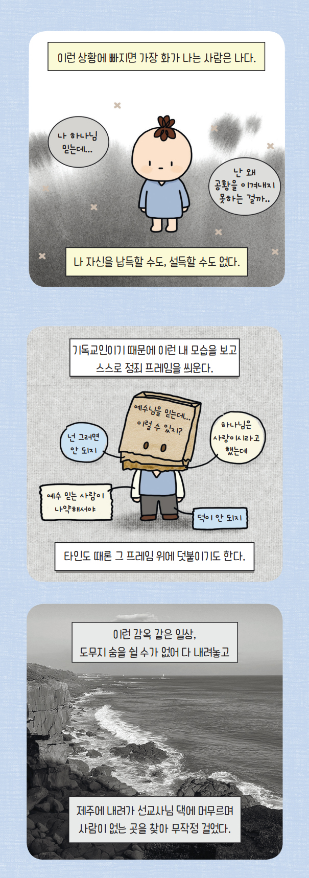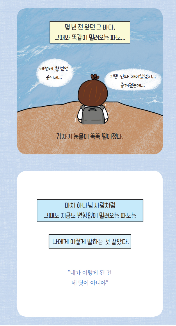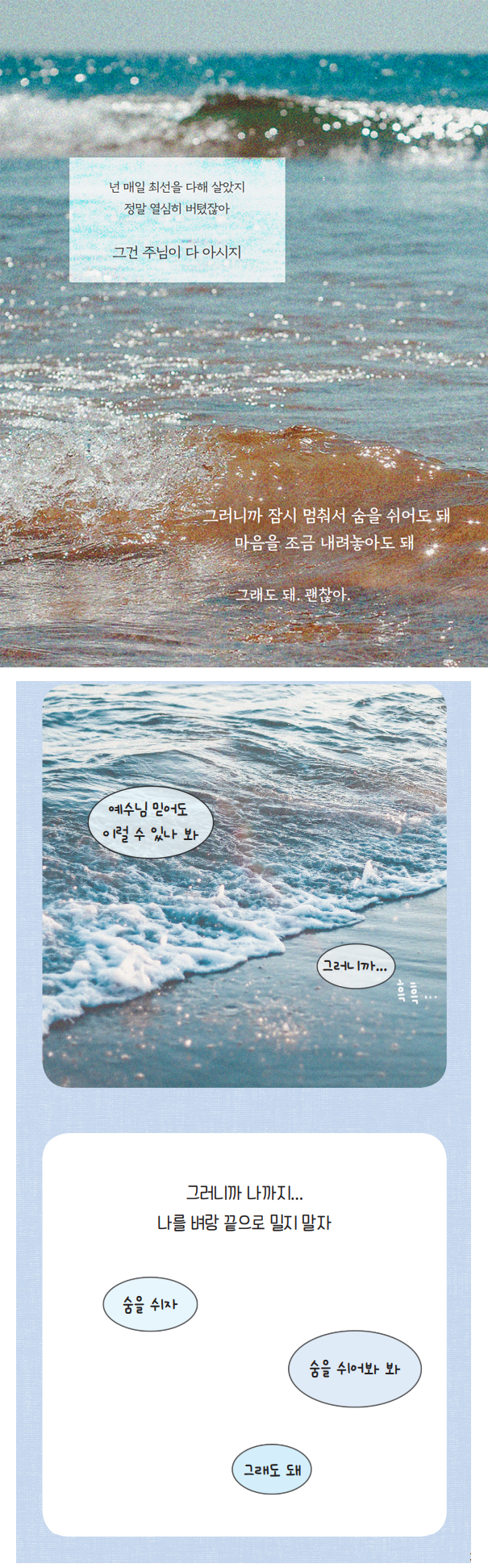 내가 발랄하고 행복했던 때도, 무척이나 어두워 기록 하나 남길 것 없이 처참하게 지나는 시절이라 해도 하나님께서는 마치 내 사랑은 이 파도와 같아서 네 상황과 상관없이 늘 동일하게 너에게 있단다,라고 말씀해주시는 것 같았다.