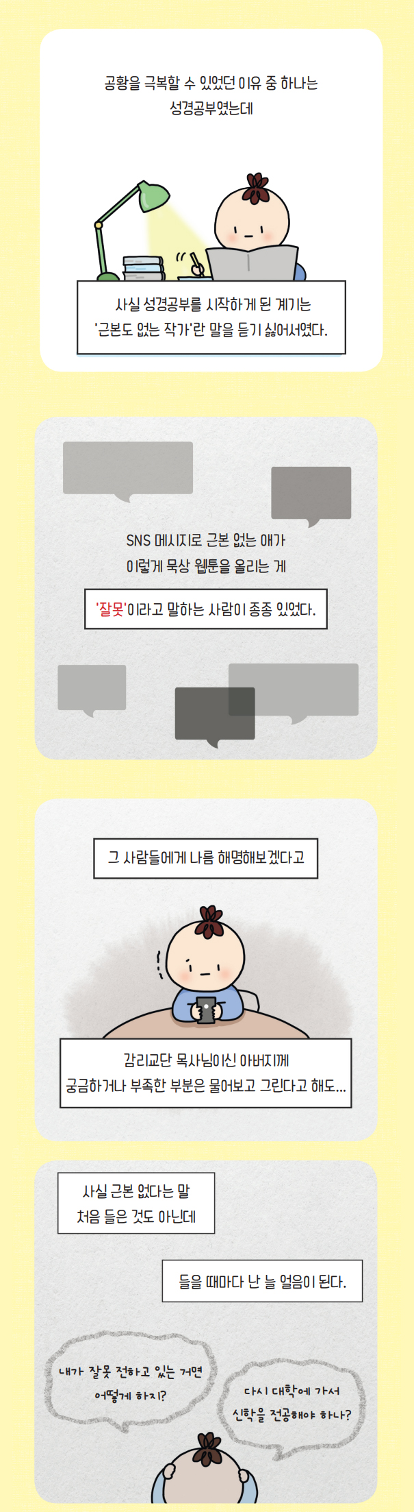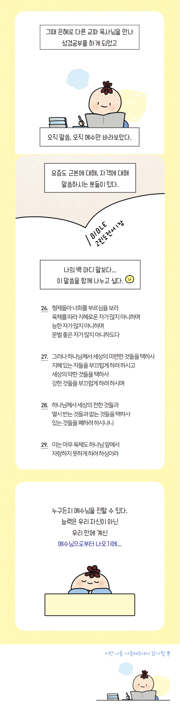 요즘은 이전에 꾸지 못했던 큰 비전을 가지고 주님께 기도한다. 작은 것이든 큰 것이든 주님께 구하는 것이 더할 나위 없이 행복하다. 웹툰의 주인도 하나님, 굿즈 사업의 사장님도 하나님, 내 삶의 주인도 하나님, 이제 나를 힘들게 하는 일과 사람, 상황으로부터 하나님께서 방패가 되어주실 것이다.