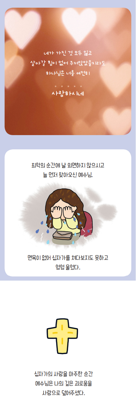 하나님, 힘들고 어려운 순간들마다 늘 저는 혼자가 아니었습니다. 제 곁에 주님께서 계셨고, 십자가 그 사랑으로 저를 감싸 안아주시며 위로하고 계셨습니다. 내 삶에 남는 것은 오직 예수님뿐인데, 그것을 잊고 살았습니다. 주님만 바라보게 하소서. 십자가만 바라보게 하소서.