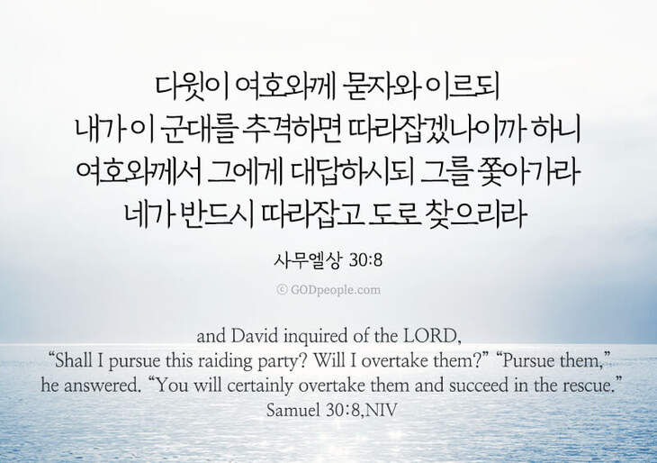 다윗이 여호와께 묻자와 이르되 내가 이 군대를 추격하면 따라잡겠나이까 하니 여호와께서 그에게 대답하시되 그를 쫓아가라 네가 반드시 따라잡고 도로 찾으리라 _사무엘상 30:8